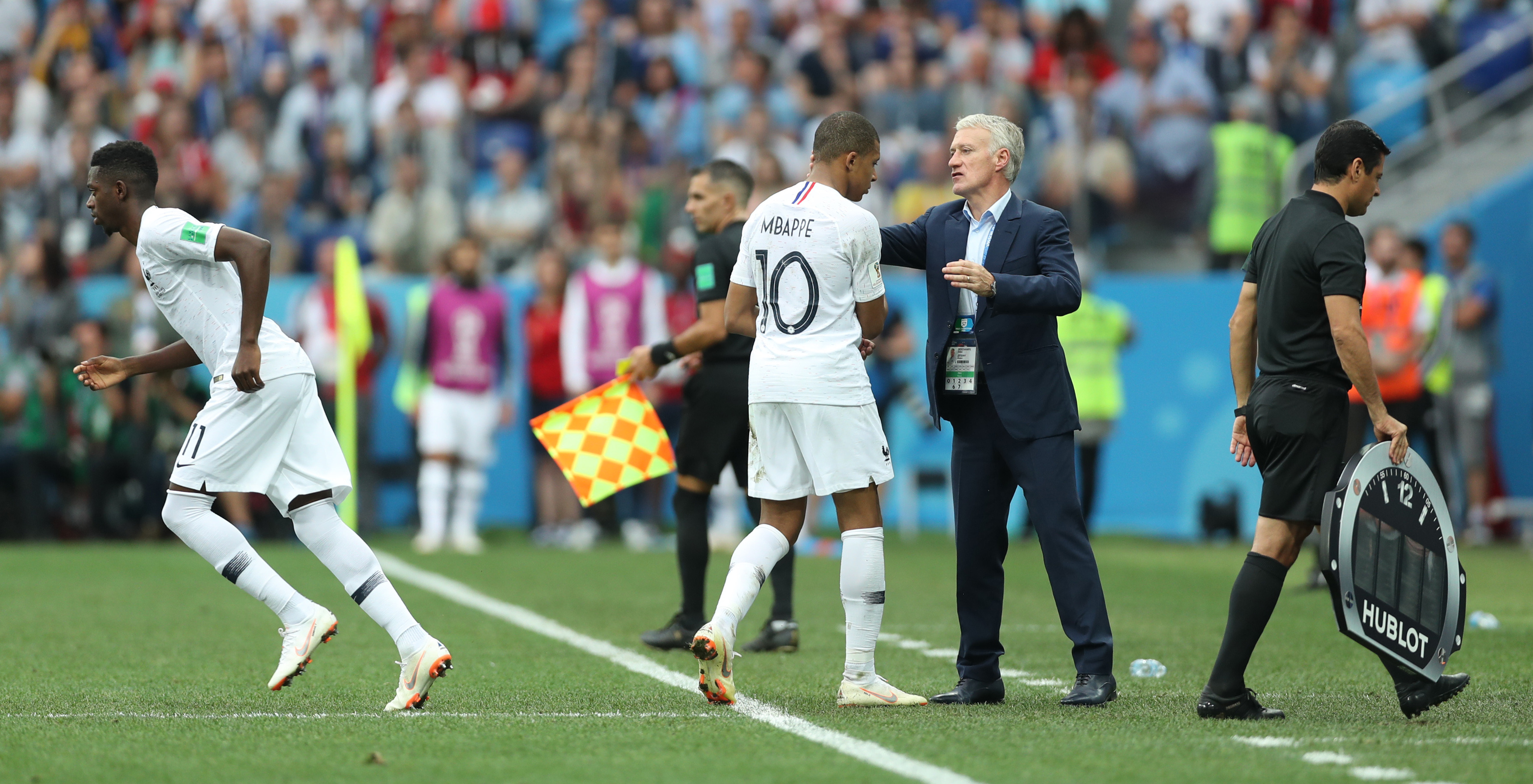 在2018俄罗斯天下杯四分之一决赛中,登贝莱(前左一)替换姆巴佩(前中)。新华社记者费茂华摄