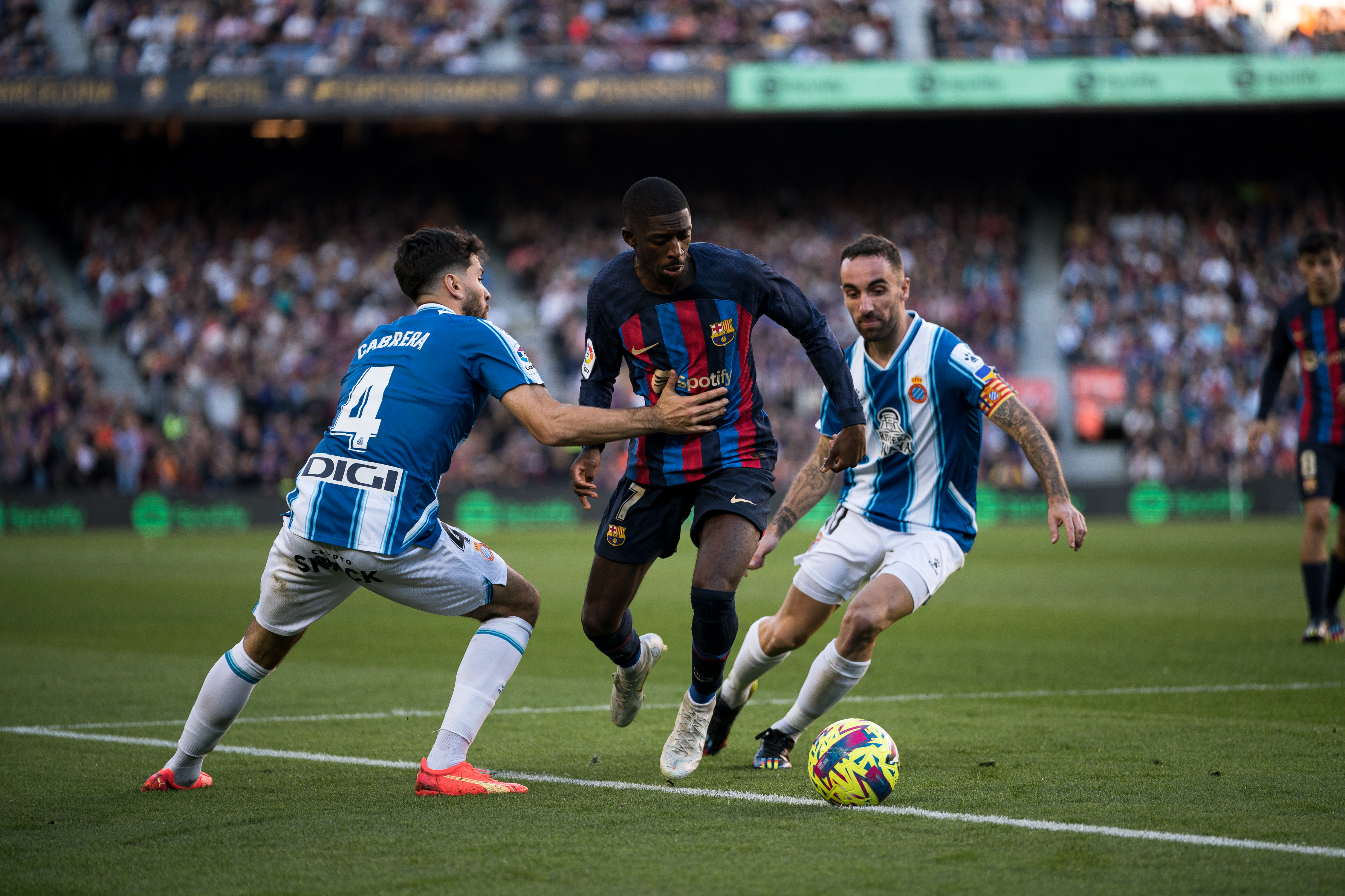 2022年12月,在西甲联赛第15轮比赛中,效率于巴塞罗那队的登贝莱(中)试图冲破西班经纪东说念主队球员的着重。新华社发(乔安·戈萨摄)