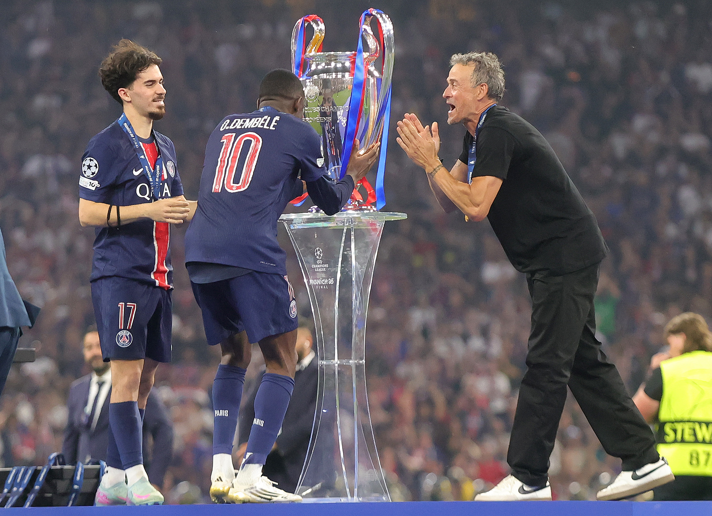 5月31日,巴黎圣日耳曼队主庄重恩里克(右)与登贝莱(中)庆祝得益队史第一座欧冠冠军奖杯。新华社发(菲利普·鲁伊兹摄)